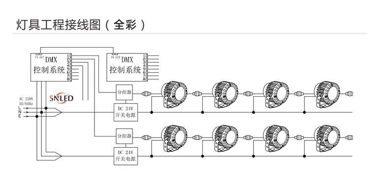 5、燈具DC24V并接不超過50/30/20/15臺,超過50/30/20/15臺請增加電源輸入線;